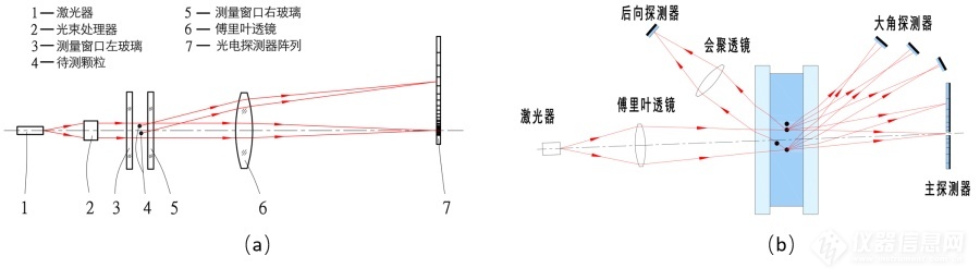 图6是当前国内外比较有影响力的几种品牌的激光粒度仪的散射光接收系统的光路图。其中图 (a)称为经典光路,又称正傅里叶变化光路。是激光粒度仪发展的早期就开始采用的光路。其特点是用平行激光束垂直入射到测量窗(池),相同角度的散射光通过傅里叶镜头后被聚焦到探测器的一个点上。其缺点是系统能接收的最大散射角受傅里叶镜头的孔径限制。目前能达到的最大孔径角是45°。如果颗粒分散在水介质中,那么对应的最大散射角是32°。这样的系统能测量的最小粒径约为0.4微米。