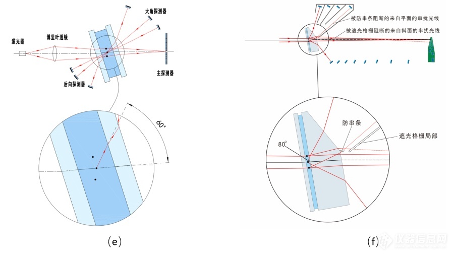 图6(e)称为“斜置平行窗口”方案或“照明光斜入射”方案。作者最早于2010年提出该方案(专利)。它的优点是用一束照明光就可以突破全反射的限制,却没有多光束方案的数据拼接难题。比如说斜置20,被接收的最大散射角就可以增加到60°。但是要完全消除全反射的影响,必须斜置70°。此时入射光在探测平面上不能良好聚焦,从而影响了大颗粒的测量。这是作者没有在bw必威西汉姆联官网的产品中采用这种方案的原因,但有其他国产品牌在用这种方案。