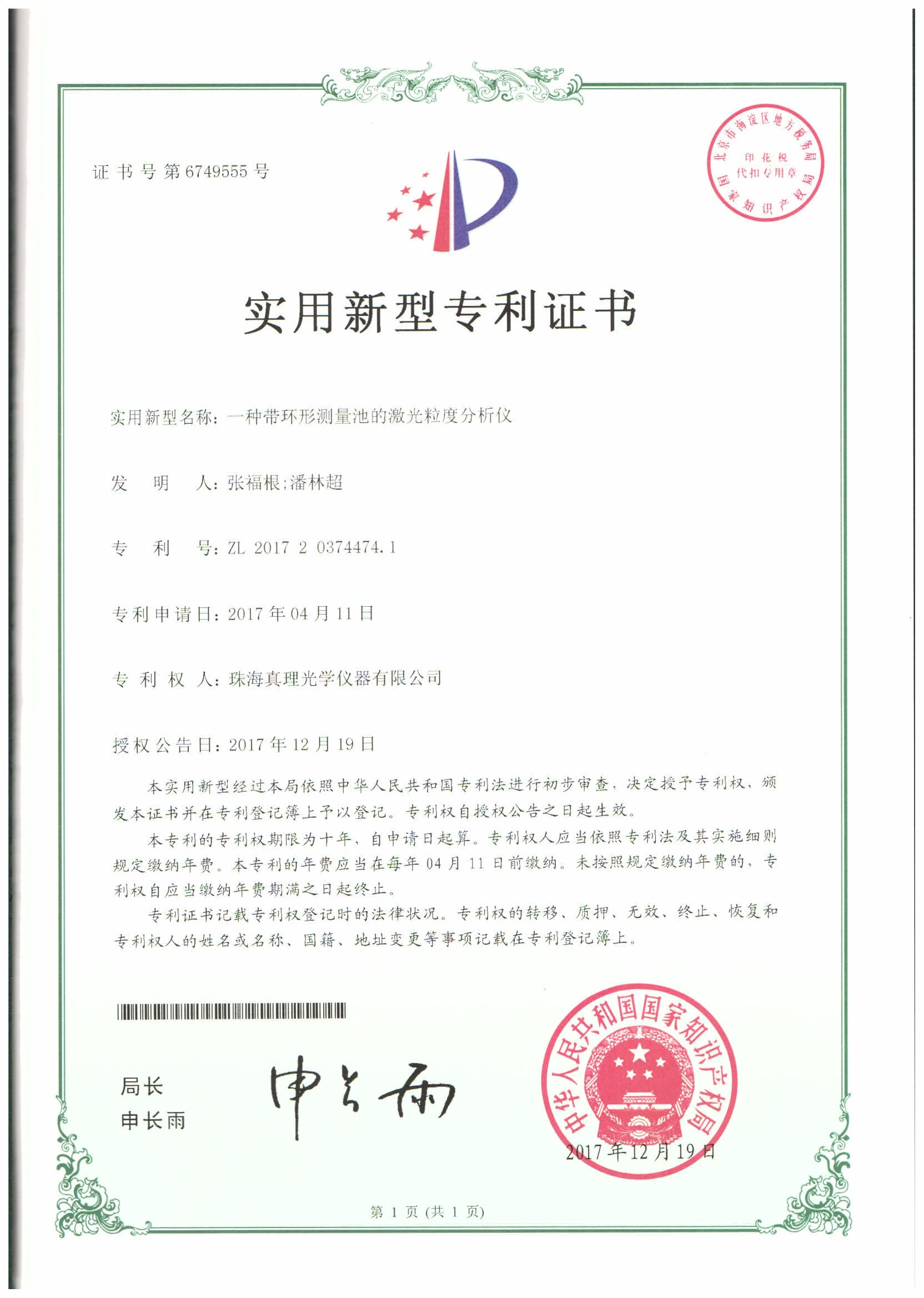 专利证书:一种带环形测量池的激光粒度分析仪201720374474.1