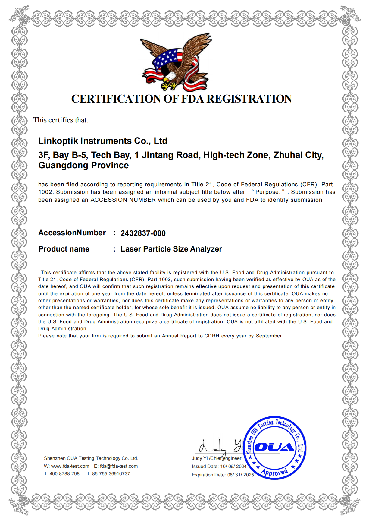 专利证书:一种带液体鞘流测量池的激光粒度分析仪201921219223.1