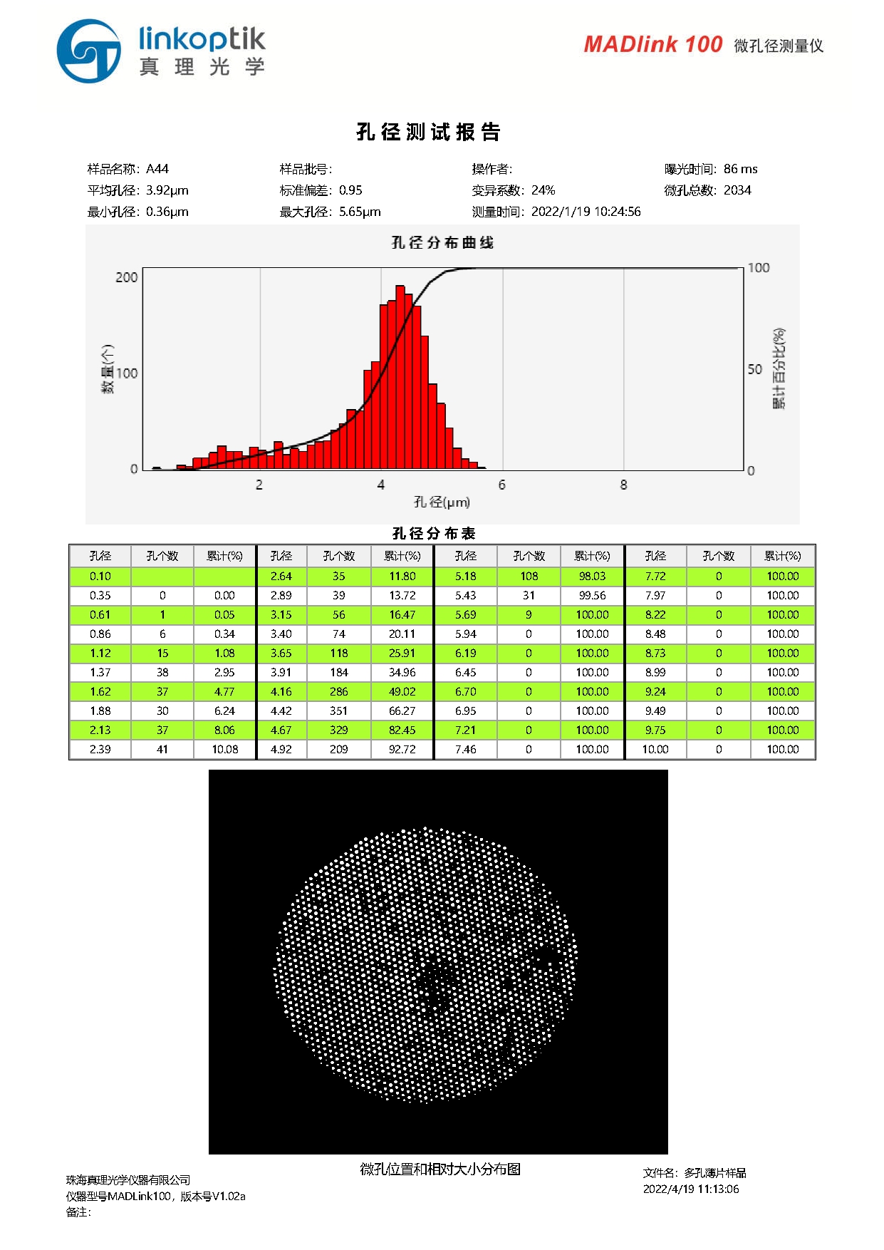 微孔径快速测量仪是一款专门应用于快速测量薄片上的微孔直径的光学仪器,有效解决了传统方法光学采用显微图像处理技术和电子显微镜都无法实现对薄片微孔孔径全检的技术难题。其特点是对薄片全域范围(最大面积5.0x4.5mm)的所有微孔只需一次抓拍,即可输出薄片上全部微孔的孔径特征、孔径分布和微孔位置分布图。